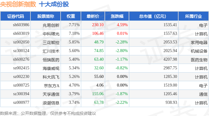证券之星消息,11月3日,央视创新(399551)指数报收于10468.04点,跌0.09%,成交778.1亿元,换手率1.89%。当日该指数成份股中,上涨的有25家,汇顶科技以5.96%的涨幅领涨,下跌的有21家,福晶科技以3.05%的跌幅领跌。