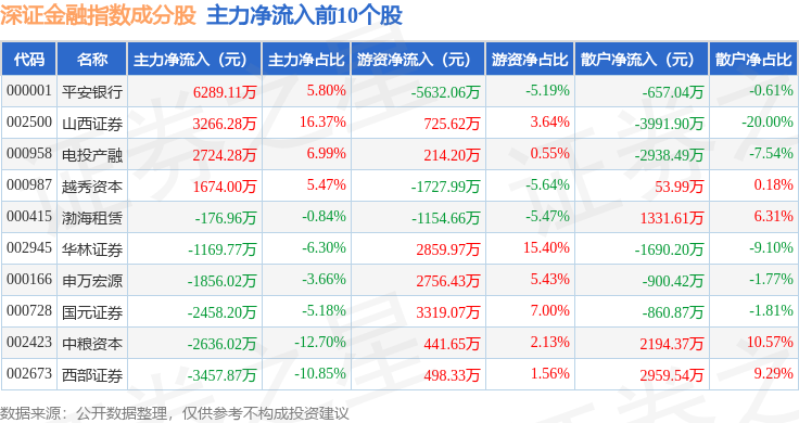 资金流向方面,深证金融(399619)指数成份股当日主力资金净流出合计11.66亿元,游资资金净流入合计3.76亿元,散户资金净流入合计7.9亿元。成份股资金流向详情见下表: