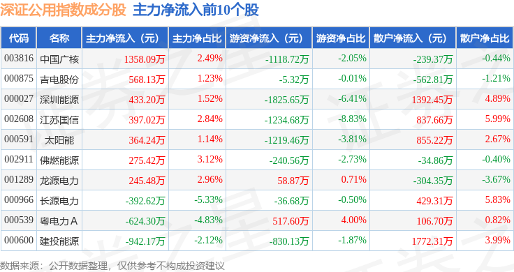 资金流向方面,深证公用(399622)指数成份股当日主力资金净流出合计2.04亿元,游资资金净流出合计4748.4万元,散户资金净流入合计2.51亿元。成份股资金流向详情见下表: