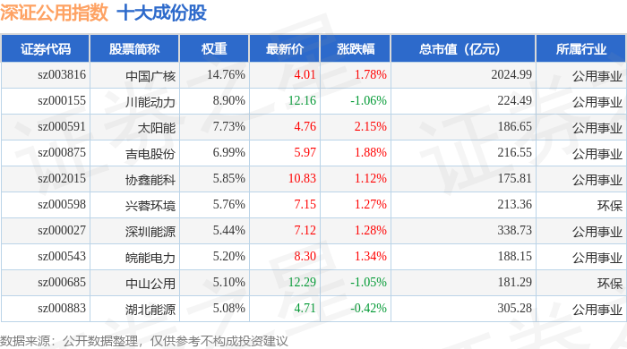 深证公用(399622)指数十大成份股详情如下: