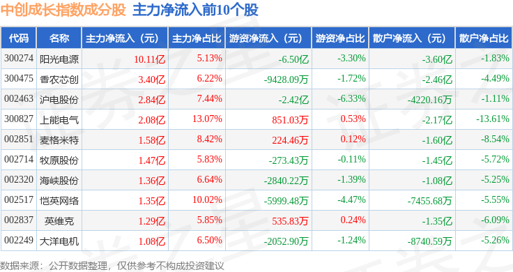 资金流向方面,中创成长(399626)指数成份股当日主力资金净流出合计68.95亿元,游资资金净流入合计4.97亿元,散户资金净流入合计63.98亿元。成份股资金流向详情见下表: