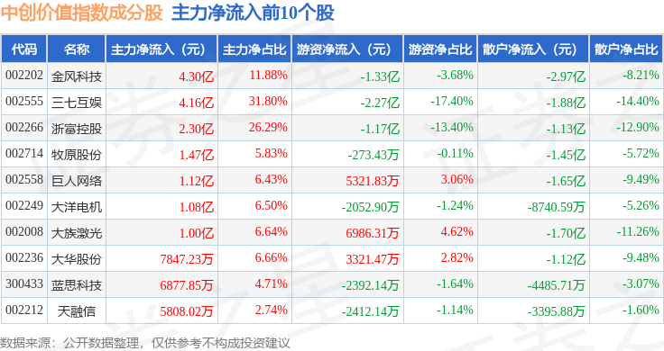 资金流向方面,中创价值(399627)指数成份股当日主力资金净流出合计27.76亿元,游资资金净流入合计8.85亿元,散户资金净流入合计18.92亿元。成份股资金流向详情见下表:
