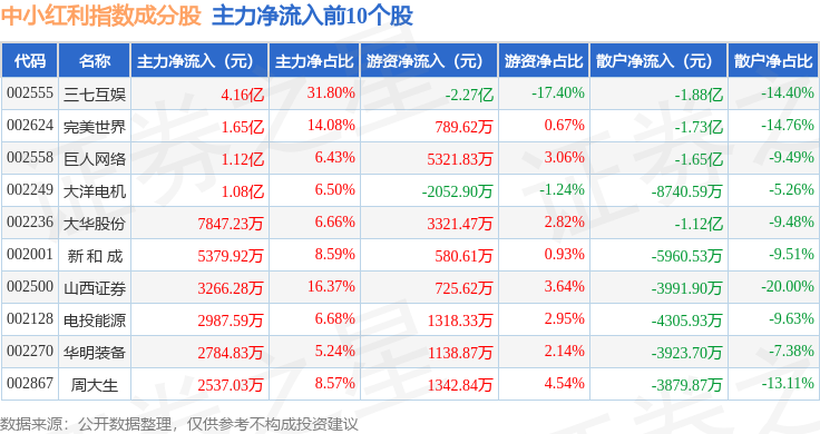 资金流向方面,中小红利(399649)指数成份股当日主力资金净流入合计3196.52万元,游资资金净流入合计169.1万元,散户资金净流出合计3365.62万元。成份股资金流向详情见下表: