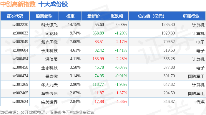 中创高新(399652)指数十大成份股详情如下: