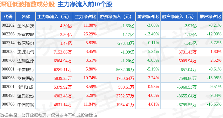 资金流向方面,深证低波(399661)指数成份股当日主力资金净流出合计12.27亿元,游资资金净流入合计3597.17万元,散户资金净流入合计11.91亿元。成份股资金流向详情见下表: