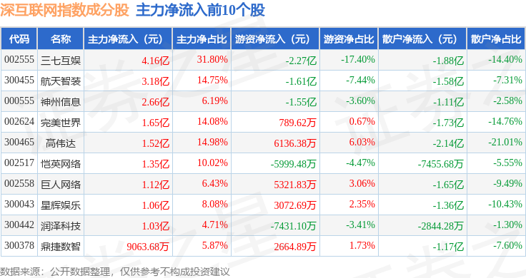 资金流向方面,深互联网(399675)指数成份股当日主力资金净流出合计4.98亿元,游资资金净流入合计2.13亿元,散户资金净流入合计2.85亿元。成份股资金流向详情见下表: