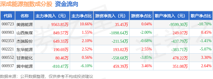 资金流向方面,深成能源(399680)指数成份股当日主力资金净流入合计1.05亿元,游资资金净流出合计1181.0万元,散户资金净流出合计9342.44万元。成份股资金流向详情见下表: