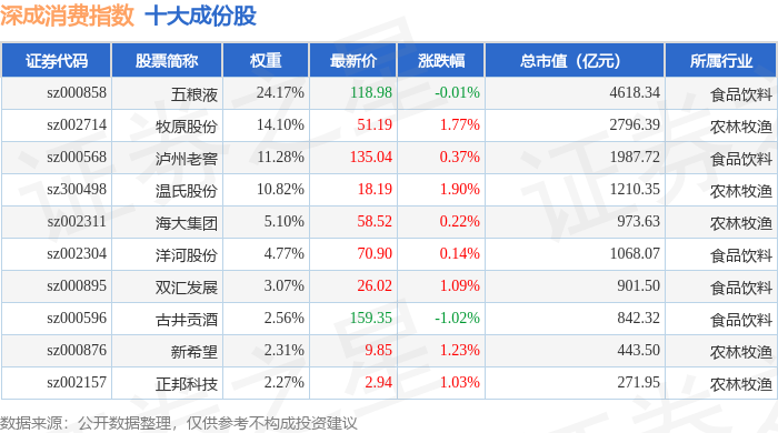 证券之星消息,11月3日,深成消费(399684)指数报收于1935.62点,涨0.43%,成交141.18亿元,换手率0.94%。当日该指数成份股中,上涨的有18家,立华股份以2.44%的涨幅领涨,下跌的有9家,古井贡酒以1.02%的跌幅领跌。