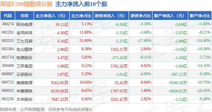 资金流向方面,深证F200(399703)指数成份股当日主力资金净流出合计80.22亿元,游资资金净流入合计11.08亿元,散户资金净流入合计69.14亿元。成份股资金流向详情见下表: