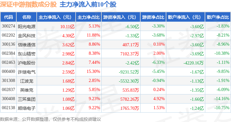资金流向方面,深证中游(399705)指数成份股当日主力资金净流出合计56.92亿元,游资资金净流入合计7.61亿元,散户资金净流入合计49.3亿元。成份股资金流向详情见下表: