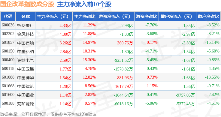 资金流向方面,国企改革(399974)指数成份股当日主力资金净流出合计44.43亿元,游资资金净流入合计10.3亿元,散户资金净流入合计34.13亿元。成份股资金流向详情见下表: