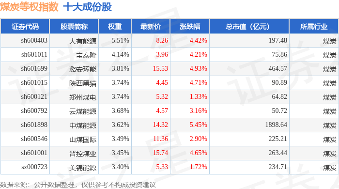 证券之星消息,11月3日,煤炭等权(399990)指数报收于3291.31点,涨2.26%,成交150.97亿元,换手率1.75%。当日该指数成份股中,上涨的有27家,中煤能源以5.45%的涨幅领涨,下跌的有3家,上海能源以0.43%的跌幅领跌。