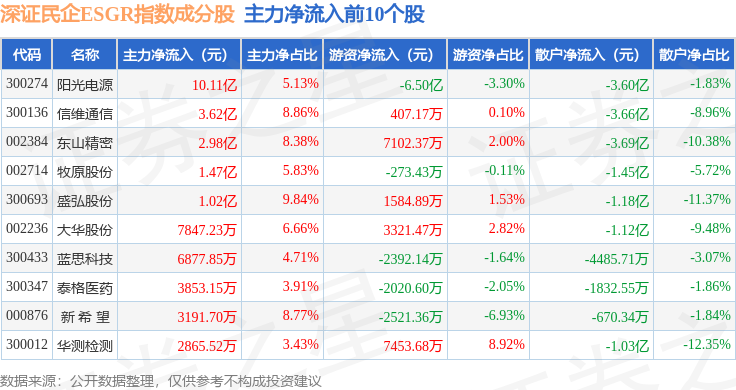 资金流向方面,深证民企ESGR(470056)指数成份股当日主力资金净流出合计24.44亿元,游资资金净流入合计2.17亿元,散户资金净流入合计22.27亿元。成份股资金流向详情见下表: