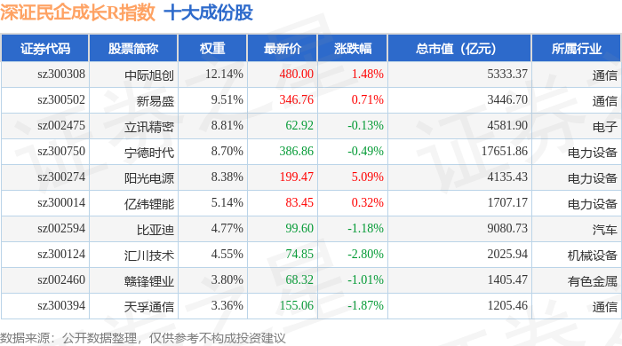证券之星消息,11月3日,深证民企成长R(470071)指数报收于4367.19点,涨0.14%,成交1312.71亿元,换手率3.12%。当日该指数成份股中,上涨的有21家,阳光电源以5.09%的涨幅领涨,下跌的有29家,中科电气以5.91%的跌幅领跌。