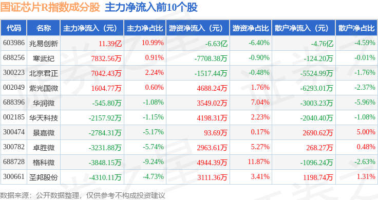 资金流向方面,国证芯片R(480017)指数成份股当日主力资金净流出合计32.79亿元,游资资金净流入合计10.18亿元,散户资金净流入合计22.61亿元。成份股资金流向详情见下表: