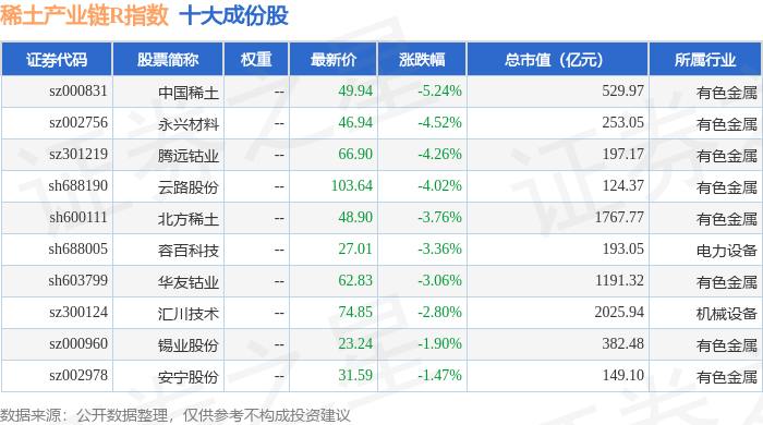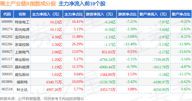 资金流向方面,稀土产业链R(489013)指数成份股当日主力资金净流出合计8.6亿元,游资资金净流出合计6.88亿元,散户资金净流入合计15.48亿元。成份股资金流向详情见下表: