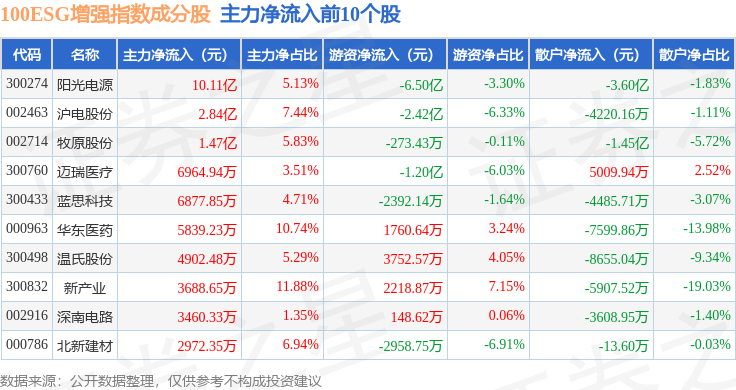 资金流向方面,100ESG增强(970033)指数成份股当日主力资金净流出合计34.45亿元,游资资金净流入合计2.64亿元,散户资金净流入合计31.81亿元。成份股资金流向详情见下表: