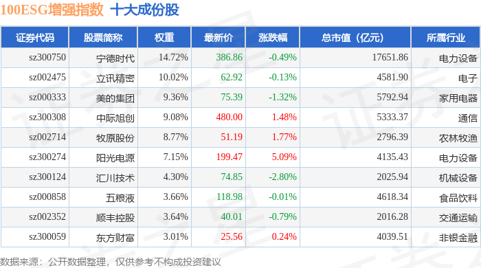 证券之星消息,11月3日,100ESG增强(970033)指数报收于1566.44点,涨0.28%,成交1280.28亿元,换手率1.38%。当日该指数成份股中,上涨的有19家,阳光电源以5.09%的涨幅领涨,下跌的有20家,汇川技术以2.8%的跌幅领跌。