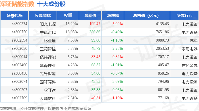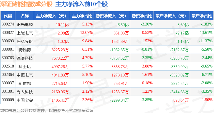 资金流向方面,深证储能(970036)指数成份股当日主力资金净流出合计57.26亿元,游资资金净流入合计1.61亿元,散户资金净流入合计55.65亿元。成份股资金流向详情见下表: