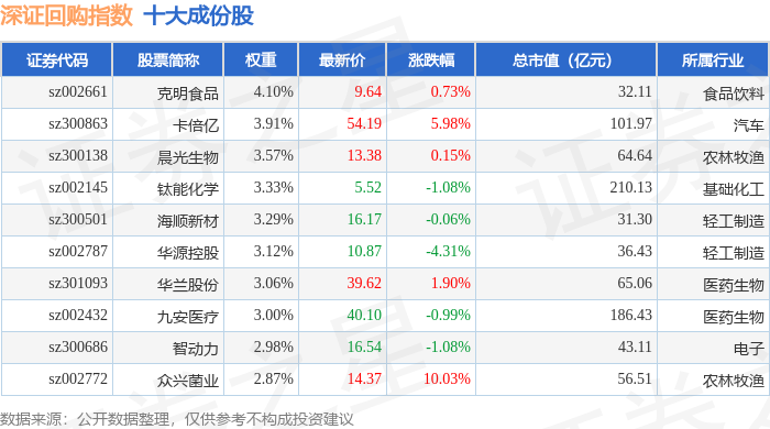 证券之星消息,11月3日,深证回购(970063)指数报收于2794.42点,涨0.48%,成交178.32亿元,换手率1.37%。当日该指数成份股中,上涨的有31家,众兴菌业以10.03%的涨幅领涨,下跌的有19家,若羽臣以5.11%的跌幅领跌。