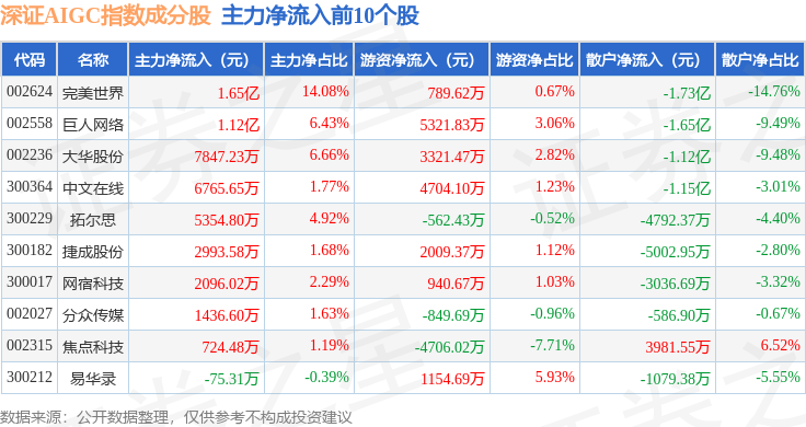 资金流向方面,深证AIGC(970075)指数成份股当日主力资金净流出合计19.38亿元,游资资金净流入合计8.44亿元,散户资金净流入合计10.94亿元。成份股资金流向详情见下表: