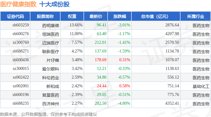 医疗健康(980016)指数十大成份股详情如下: