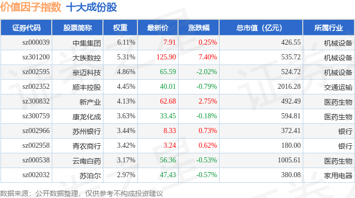证券之星消息,11月3日,价值因子(980056)指数报收于2597.75点,涨0.65%,成交472.63亿元,换手率1.44%。当日该指数成份股中,上涨的有27家,大族数控以7.4%的涨幅领涨,下跌的有23家,中钨高新以2.82%的跌幅领跌。