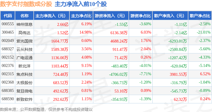 资金流向方面,数字支付(980113)指数成份股当日主力资金净流出合计4.59亿元,游资资金净流入合计2.41亿元,散户资金净流入合计2.18亿元。成份股资金流向详情见下表:
