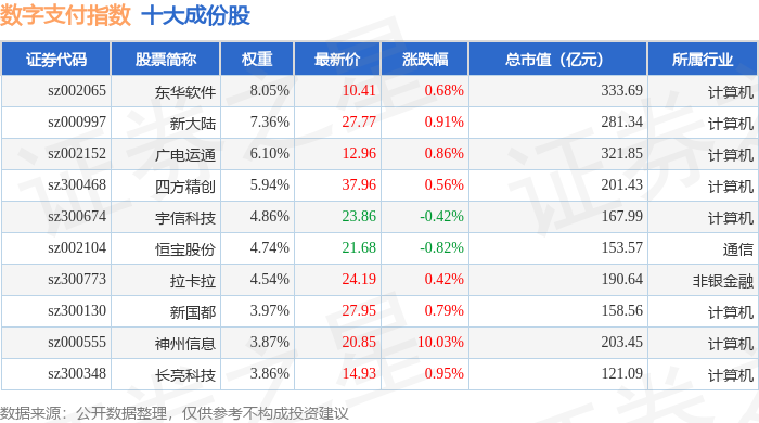 证券之星消息,11月3日,数字支付(980113)指数报收于1939.28点,涨0.9%,成交344.61亿元,换手率2.89%。当日该指数成份股中,上涨的有38家,神州信息以10.03%的涨幅领涨,下跌的有12家,艾融软件以2.04%的跌幅领跌。