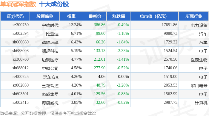 证券之星消息,11月3日,单项冠军(980150)指数报收于8393.86点,跌0.36%,成交1361.6亿元,换手率1.95%。当日该指数成份股中,上涨的有24家,金风科技以6.94%的涨幅领涨,下跌的有25家,先导智能以6.37%的跌幅领跌。