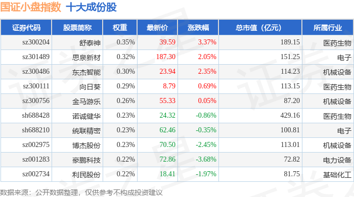 证券之星消息,11月3日,国证小盘(980202)指数报收于1784.7点,涨0.72%,成交2045.12亿元,换手率4.1%。当日该指数成份股中,上涨的有973家,迪尔化工以20.75%的涨幅领涨,下跌的有507家,清越科技以20.02%的跌幅领跌。