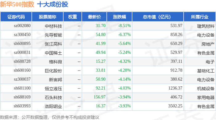 新华500(989001)指数十大成份股详情如下: