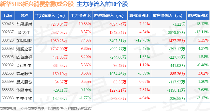 资金流向方面,新华SHS新兴消费(989006)指数成份股当日主力资金净流出合计30.56亿元,游资资金净流入合计6.33亿元,散户资金净流入合计24.23亿元。成份股资金流向详情见下表: