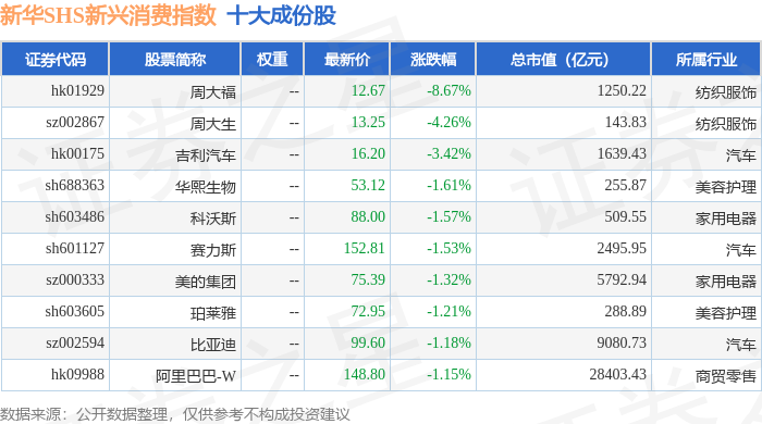 新华SHS新兴消费(989006)指数十大成份股详情如下: