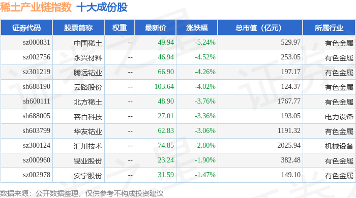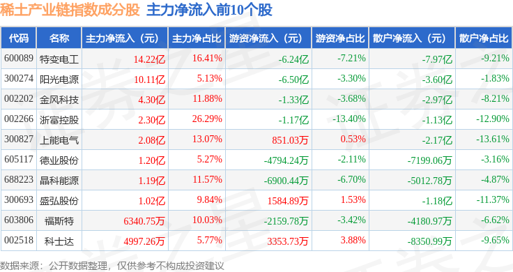 资金流向方面,稀土产业链(989013)指数成份股当日主力资金净流出合计8.6亿元,游资资金净流出合计6.88亿元,散户资金净流入合计15.48亿元。成份股资金流向详情见下表: