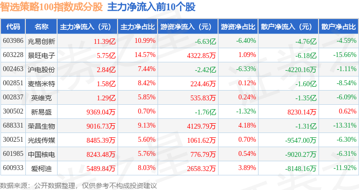 资金流向方面,智选策略100(989015)指数成份股当日主力资金净流出合计21.13亿元,游资资金净流入合计13.59亿元,散户资金净流入合计7.54亿元。成份股资金流向详情见下表: