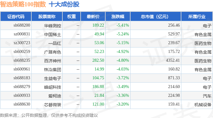 证券之星消息,11月3日,智选策略100(989015)指数报收于4082.85点,跌0.64%,成交1838.15亿元,换手率1.94%。当日该指数成份股中,上涨的有37家,景旺电子以6.34%的涨幅领涨,下跌的有62家,华峰测控以5.41%的跌幅领跌。