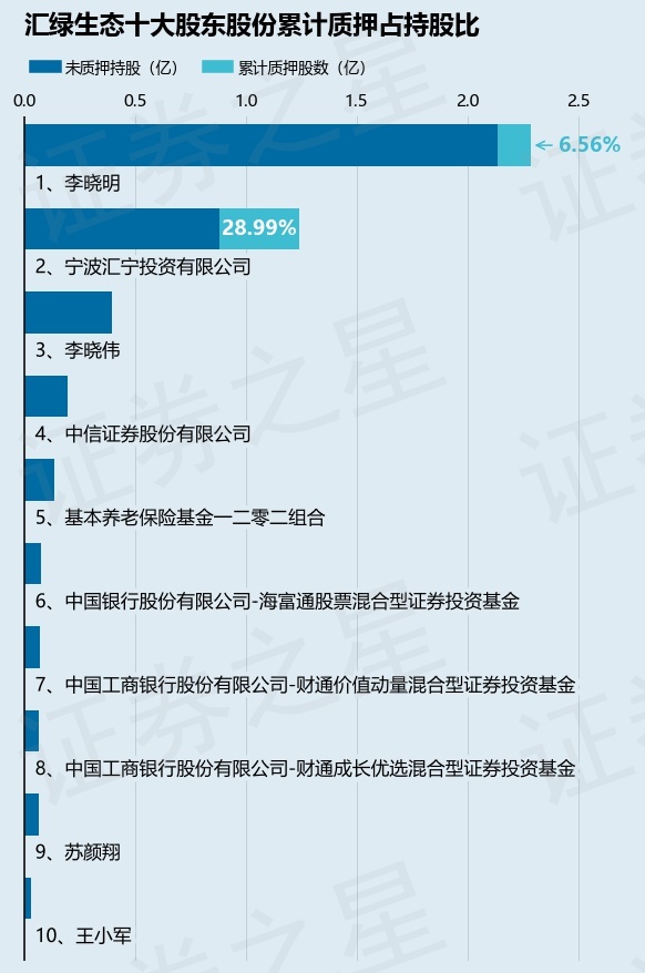 截止本公告日,股东李晓明已累计质押股份1500.0万股,占其持股总数的6.56%,股东宁波汇宁投资有限公司已累计质押股份3600.0万股,占其持股总数的28.99%。本次质押后汇绿生态十大股东的累计质押股份占持股比例(占持股比例的计算以公司最新一期财务报表公布的十大股东的持股总数为基准)见下图: