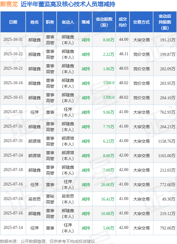 聚赛龙近半年内的董监高及核心技术人员增减持详情如下: