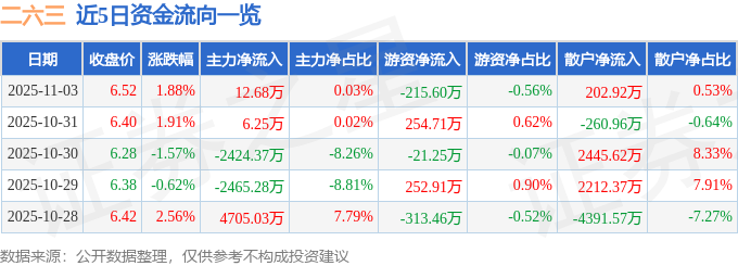 证券之星消息,截至2025年11月3日收盘,二六三(002467)报收于6.52元,上涨1.88%,换手率4.32%,成交量59.07万手,成交额3.83亿元。