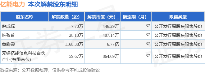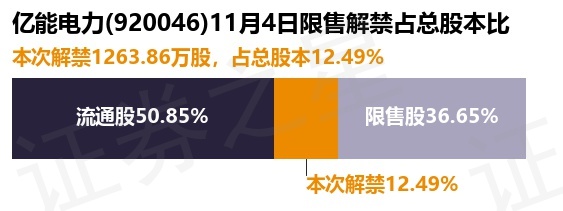 证券之星消息,根据市场公开信息整理,亿能电力(920046)于11月4日将有1263.86万股限售股份解禁,为公司公开发行原股东限售股份,占公司总股本12.49%。(本次数据根据历史公告整理得出,实际情况以上市公司最新公告为准)本次解禁后,公司还有3707.27万股限售股份,占总股本36.65%。具体如下图所示: