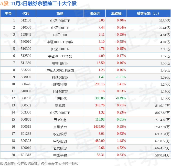 A股融券余额前三分别为:中证1000ETF(512100)融券余额25.59亿元、中证500ETF(510500)融券余额25.41亿元、中证1000(159845)融券余额4.81亿元,前20具体见下表: