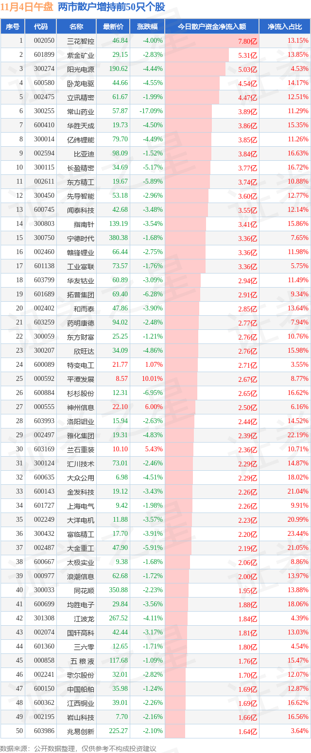 两市散户增持最多的前十只个股为: