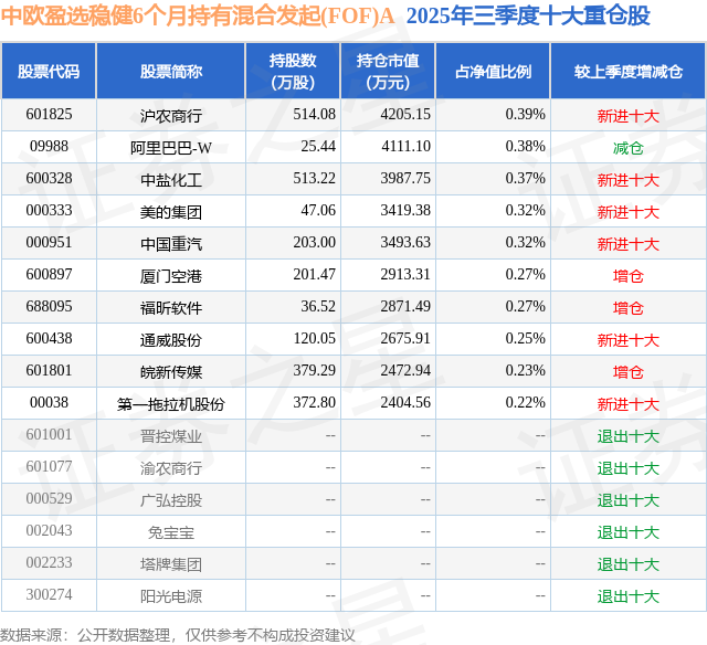 中欧盈选稳健6个月持有混合发起(FOF)A的前十大重仓股如下: