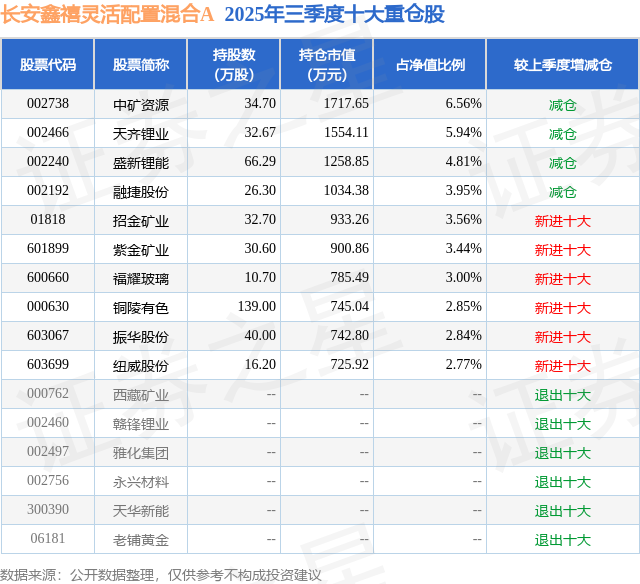 长安鑫禧灵活配置混合A的前十大重仓股如下: