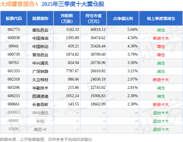 大成睿享混合A的前十大重仓股如下: