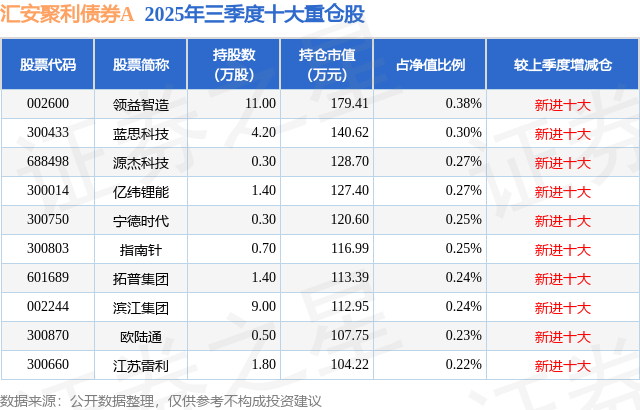 根据2025基金Q3季报公募基金重仓股数据,重仓该股的公募基金共1家,其中持有数量最多的公募基金为汇安基金的汇安聚利债券A。汇安聚利债券A目前规模为2.36亿元,最新净值1.0021(11月3日),较上一交易日上涨0.04%。该公募基金现任基金经理为张昆 柳预才。张昆在任的基金产品包括:汇安恒利39个月定开纯债债券,管理时间为2020年12月23日至今,期间收益率为7.9%;汇安盛鑫三年定开纯债债券,管理时间为2021年1月12日至今,期间收益率为13.55%;汇安裕同纯债债券A,管理时间为2022年6月22日至今,期间收益率为12.02%;汇安信泰稳健一年持有期混合A,管理时间为2024年3月26日至今,期间收益率为5.68%。柳预才在任的基金产品包括:汇安宜创量化精选混合A,管理时间为2020年12月30日至今,期间收益率为19.73%;汇安中证500增强A,管理时间为2022年12月23日至今,期间收益率为32.91%;汇安多因子混合A,管理时间为2023年5月29日至今,期间收益率为38.05%;汇安多策略混合A,管理时间为2023年6月6日至今,期间收益率为50.67%。