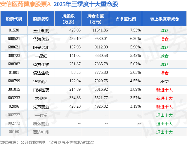 根据2025基金Q3季报公募基金重仓股数据,重仓该股的公募基金共4家,其中持有数量最多的公募基金为安信基金的安信医药健康股票A。安信医药健康股票A目前规模为4.13亿元,最新净值1.4848(11月3日),较上一交易日上涨0.3%,近一年上涨52.22%。该公募基金现任基金经理为池陈森。