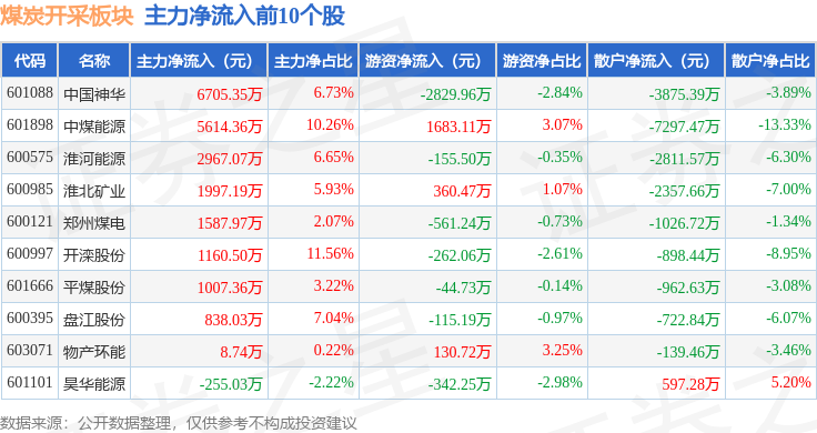 从资金流向上来看,当日煤炭开采板块主力资金净流出2.34亿元,游资资金净流入1.13亿元,散户资金净流入1.21亿元。煤炭开采板块个股资金流向见下表: