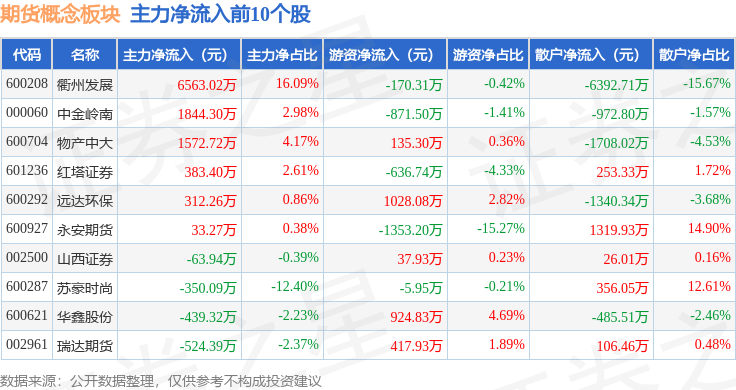 从资金流向上来看,当日期货概念板块主力资金净流出5.36亿元,游资资金净流入2.23亿元,散户资金净流入3.13亿元。期货概念板块个股资金流向见下表: